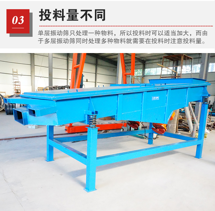 物料的篩分能力是由投料的大小有著直接關系的,由于單層振動篩只處理一種物料,所以投料時可以適當加大,而由于多層振動篩同時處理多種物料就需要在投料時注意投料量。