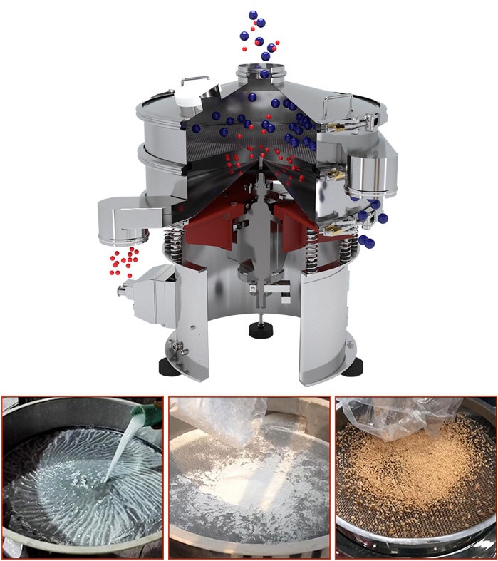 氣旋篩使用一組槳葉將產(chǎn)品推出篩網(wǎng)圓柱體,高速旋轉(zhuǎn)它們并對(duì)產(chǎn)品施加離心力,圓柱體水平安裝,因此對(duì)槳葉施加輕微的扭轉(zhuǎn)以將產(chǎn)品沿著圓柱體的長度向下移動(dòng),并且使用螺旋鉆以穩(wěn)定的速度喂入槳葉。與振動(dòng)篩相比,這些槳葉迫使產(chǎn)品通過篩網(wǎng),從而使它們具有更高的吞吐量,旋轉(zhuǎn)螺旋鉆和槳葉組件的運(yùn)動(dòng)具有分解塊或分離壓實(shí)產(chǎn)品的額外好處。