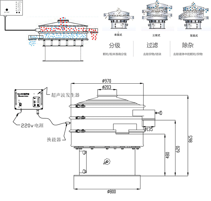 超聲波振動篩是在原有的電機帶動振動篩振動的基礎(chǔ)上,增加了超聲波系統(tǒng)。振動篩堵網(wǎng)的問題是制約篩分效率的關(guān)鍵,堵網(wǎng)問題解決了,其他問題就迎刃而解.超聲波裝置是由超聲波電源通過換能器將超聲波轉(zhuǎn)換為每秒37000次的高頻機械波作用于篩網(wǎng)表面。來起到清理篩網(wǎng)的作用。解決了由于篩孔上的靜電附著力,粉末的凝聚作用和插入粗糙網(wǎng)絲表面的微粒而造成的堵塞問題。提高了篩分效率。