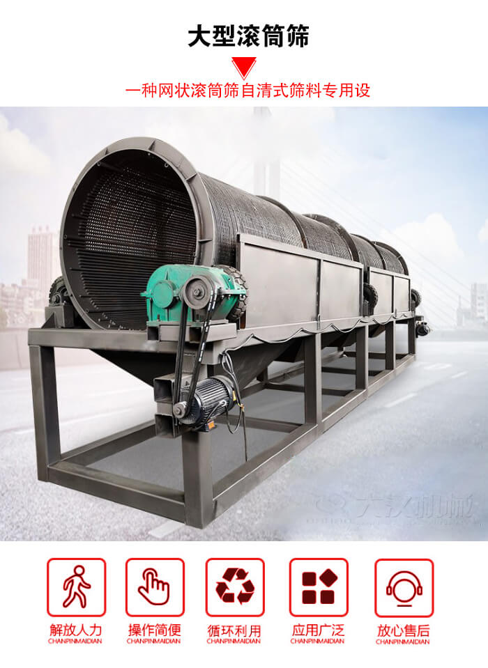 大型滾筒篩,因其獨特的結構特點,完全有效地解決了其他型式篩分設備所存在的缺點,是綜合利用電站的篩型。是繼國內各大公司生產的普通型網狀滾筒篩之后的自清式篩料專用設備。